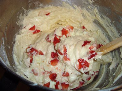 Folding the strawberries and white chocolate into the batter
